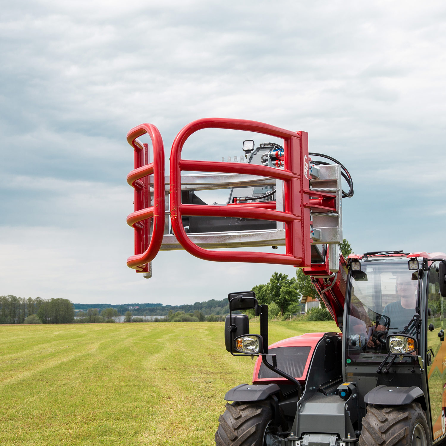 Die kompakte und schonende Bauform ermöglicht ein Laden und Stapeln von Rundballen, ohne sie zu beschädigen.