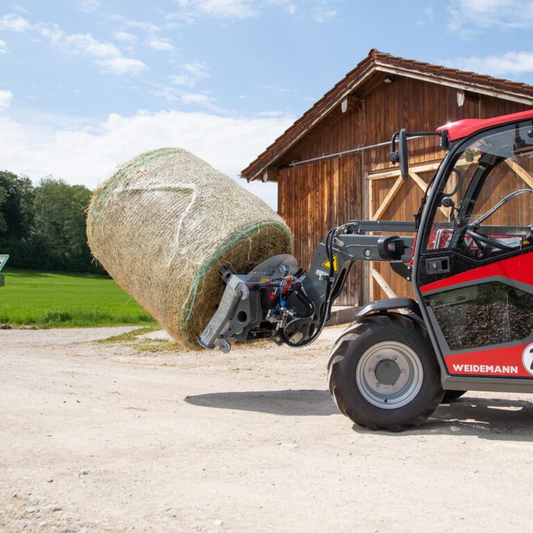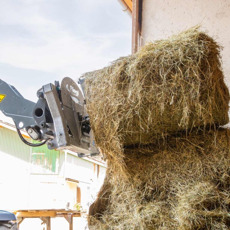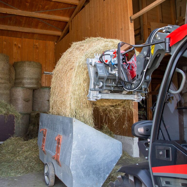 Einfaches und schnelles Abwickeln von Silage- und Strohballen über die Schlepperhydraulik – auch zum Transport geeignet.